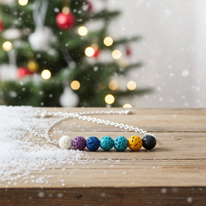 Six colored lava beads on a 16" silver-toned chain.  Simply add a few drops of your favorite Wyndmere essential oil or synergistic blend to the lava beads.  Wipe off any excess oil before wearing.  Enjoy the world of aromatherapy as you wear your necklace by inhaling the aroma on the beads.