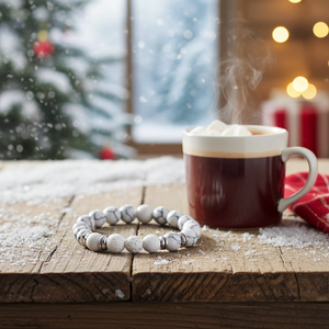 Aromatherapy bracelet with white beads, three white lava stones, and silver accents.  Simply add a few drops of your favorite Wyndmere essential oil or synergistic blend to the lava beads.  Wipe off any excess oil before wearing.  Enjoy the world of aromatherapy as you wear your bracelet by inhaling the aroma on the beads.